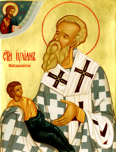 На епископское служение святитель Иулиан был поставлен самим святым апостолом Петром и им же послан проповедовать Евангелие в землях Галлии. Он прибыл в земли Кеномании (район реки По на севере нынешней Италии) и поселился в хижине неподалеку от одного из городов той области.