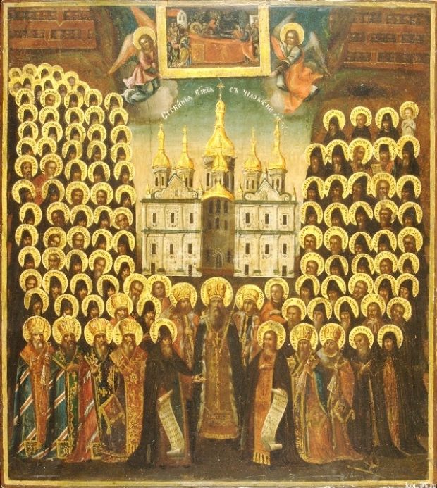 Столп огнезрачный и светоносное солнце, возсиявшее на горе Печерстей, великаго Антония со всем собором богоносных отец приводим Тебе, Христе, в молитву, ихже ради молим подаждь обители нашей благодать и душам нашим велию милость.