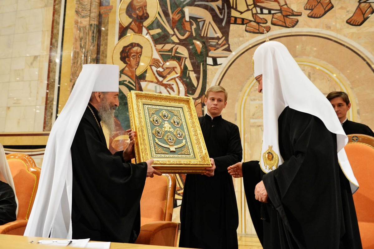 Предстоятель Украинской Православной Церкви митрополит Онуфрий подарил Патриарху Московскому и всея Руси Кириллу крест и две панагии - копии тех креста и панагий, которые 100 лет назад были возложены на его предшественника - Патриарха Тихона.