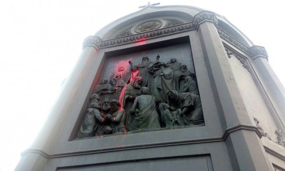 В полиции говорят, что вероятно в памятник бросили стеклянную емкость с краской. По факту повреждения памятника правоохранители открыли уголовное производство по статье «Хулиганство».