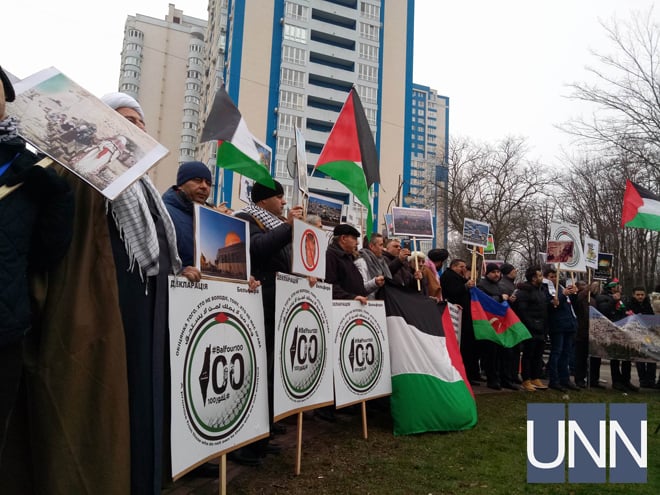 В частности, организаторы мероприятия под стенами посольства - палестинская диаспора в Украине - заявили, что акция устроена против срыва мирного процесса на Ближнем Востоке, вызванного решением американского президента Дональда Трампа о признании Иерусалима столицей Израиля.